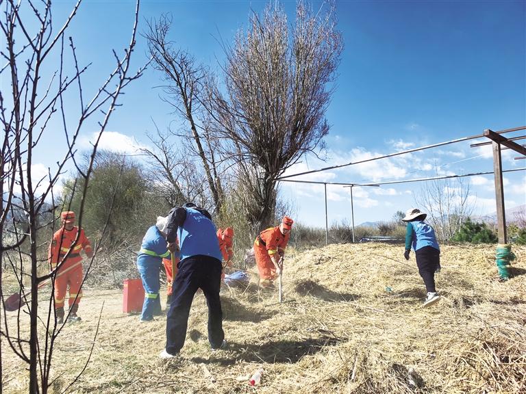 西藏森林消防總隊特勤大隊和濕地巡護(hù)人員清理可燃物。記者 王靜 攝