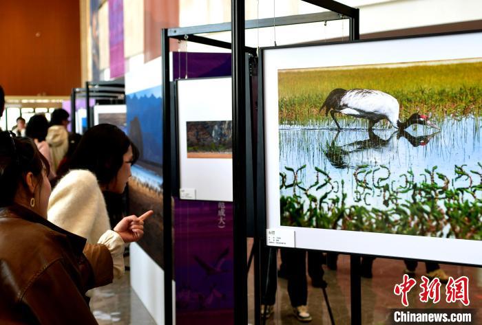 圖為觀眾欣賞黑頸鶴主題攝影展中的作品。李林 攝