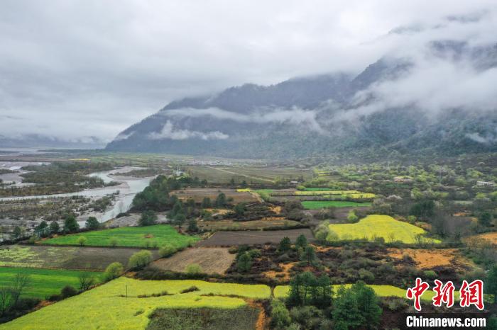 4月4日,西藏林芝市波密縣易貢鄉(xiāng)在雨后迎來絕美景致。云霧繚繞在群山之間,金黃的油菜花與森林、易貢湖、藏式民居、碧綠的青稞田相互映襯,宛如仙境。(無人機(jī)照片)中新社記者 貢嘎來松 攝