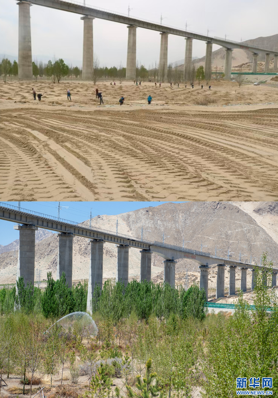 拼版照片:上圖:在西藏山南市貢嘎縣境內(nèi)拍攝的拉薩南北山造林綠化(貢嘎段)(2021年攝);下圖:在西藏山南市貢嘎縣境內(nèi)拍攝的拉薩南北山造林綠化(貢嘎段)(2025年4月24日攝)。新華網(wǎng) 旦增努布 攝