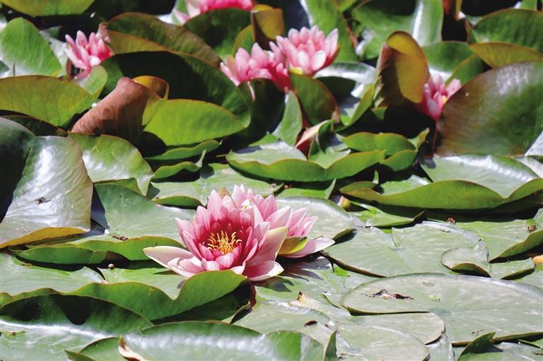 “移舟水濺差差綠,倚欄風(fēng)搖柄柄香?!弊哌M(jìn)柳梧國(guó)際總部城院內(nèi),在停車場(chǎng)的東側(cè),一池蓮花在層層蓮葉的襯托下開得正盛。走近池邊,蓮葉特殊的淡淡香味夾雜著潮濕的水汽撲面而來(lái)。粉、白的蓮花在幾場(chǎng)雨過(guò)后,迎著陽(yáng)光依次綻放。幾個(gè)孩子在池邊嬉戲追逐,時(shí)不時(shí)用手挑起水花四濺,遠(yuǎn)遠(yuǎn)看去,頗有“小姑貪戲采蓮遲”的意味。