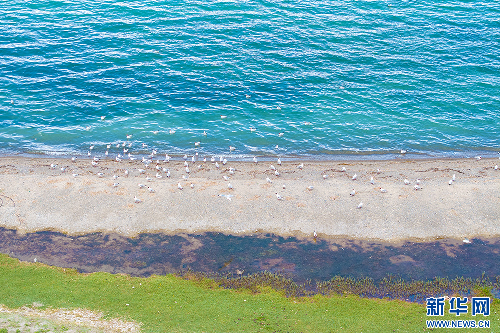 班公湖湖邊覓食的鳥類(6月15日攝,無(wú)人機(jī)照片)。新華網(wǎng) 旦增努布 攝