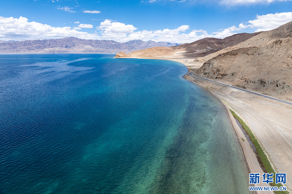 藍(lán)天白云映襯下的班公湖(6月15日攝,無(wú)人機(jī)照片)。新華網(wǎng) 旦增努布 攝
