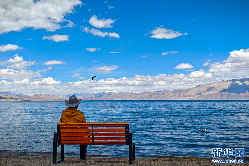 游客在班公湖邊欣賞美景(6月15日攝)。新華網(wǎng) 旦增努布 攝