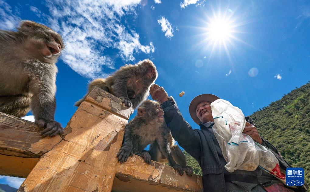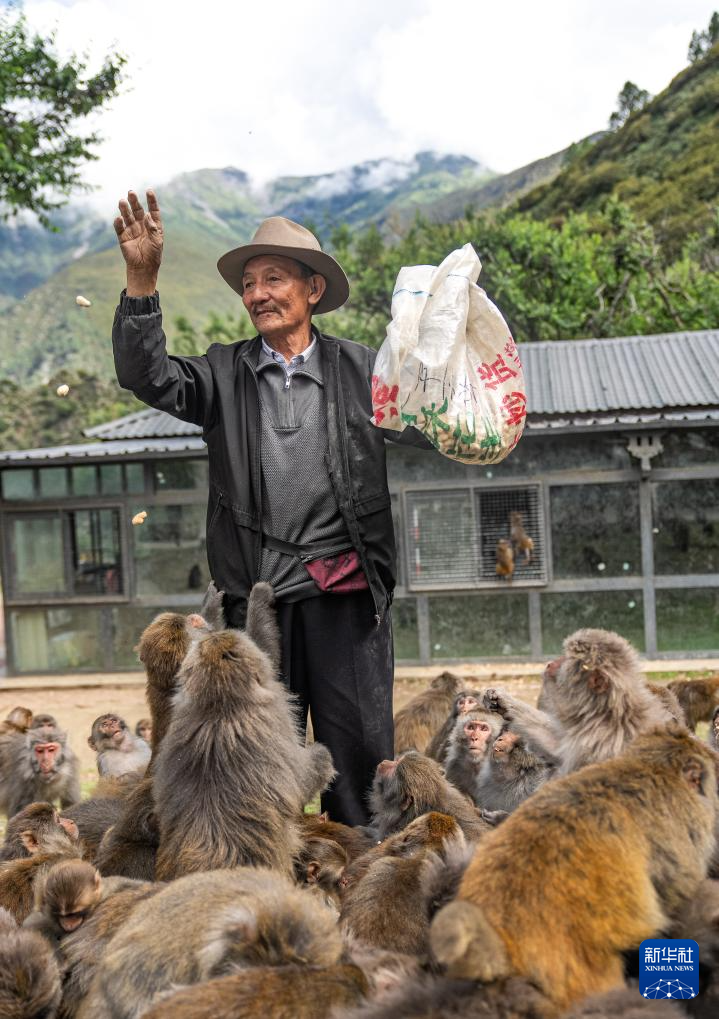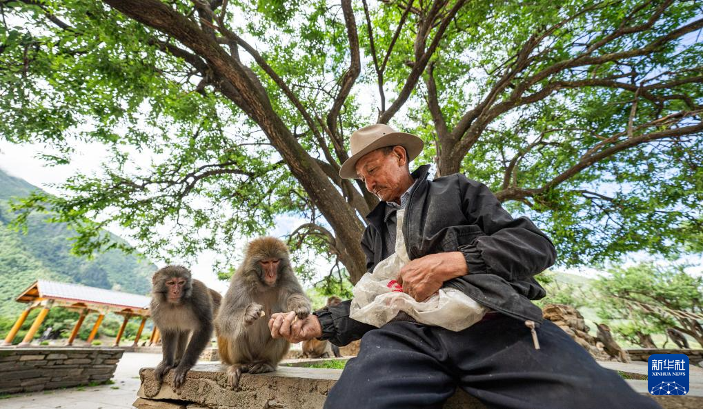 在林則生態(tài)文化旅游景區(qū),多布杰老人在給藏獼猴喂花生(7月23日攝)。新華社記者 丁增尼達(dá) 攝