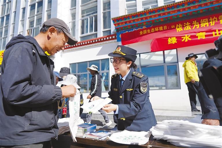 在法規(guī)宣講環(huán)節(jié),工作人員通過設立宣傳展板、懸掛宣傳橫幅、發(fā)放政策法規(guī)手冊、現(xiàn)場接受群眾咨詢答疑等形式,向群眾集中宣傳《中華人民共和國青藏高原生態(tài)保護法》及自治區(qū)實施辦法等生態(tài)環(huán)保法律法規(guī)。