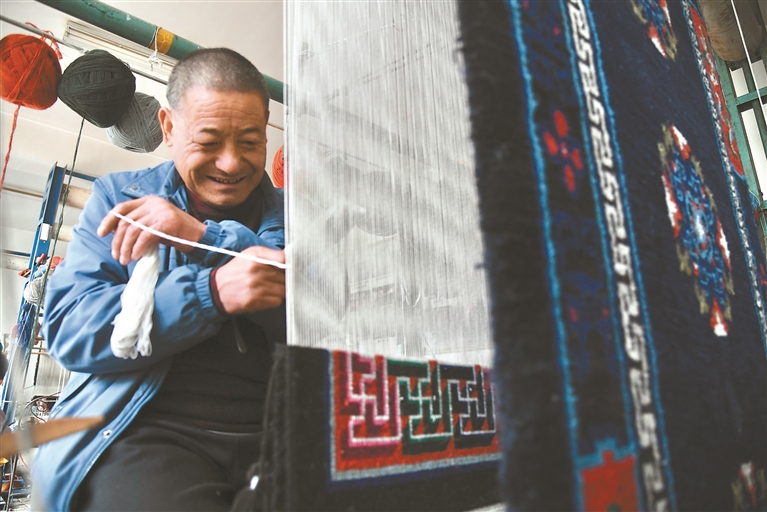 圖為楊永良在編織藏毯。青海日?qǐng)?bào)記者 李娜 魏雅琪 攝