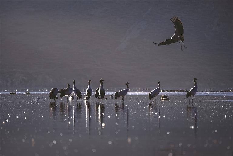 來到卡孜水庫,只見水面上薄霧未散,黑頸鶴的鳴叫聲劃破靜謐,那聲音清亮卻不刺耳,像帶著高原特有的通透感,時而短促清脆伴著水波蕩漾的輕響,似乎在訴說著高原的故事。循聲望去,幾只黑頸鶴正在湖面上悠然佇立,修長的脖頸微微彎曲,倒映在平靜的水面上,宛如水墨畫卷中的靈動筆觸;忽然間,幾只黑頸鶴率先舒展雙翼,寬大的翅膀劃破晨霧,腳掌蹬離水面時濺起細(xì)碎的水花,身姿矯健地朝著高空飛去,其余黑頸鶴也相繼展翅,追隨同伴的身影扶搖而上,朝著村落方向飛去。當(dāng)它們從錯落有致的村民住房上空掠過時,晨光恰好穿透薄霧,灑在灰褐色的羽翼上,下方屋頂升起裊裊炊煙,動靜之間,勾勒出一幅人與自然和諧共生的鮮活圖景。