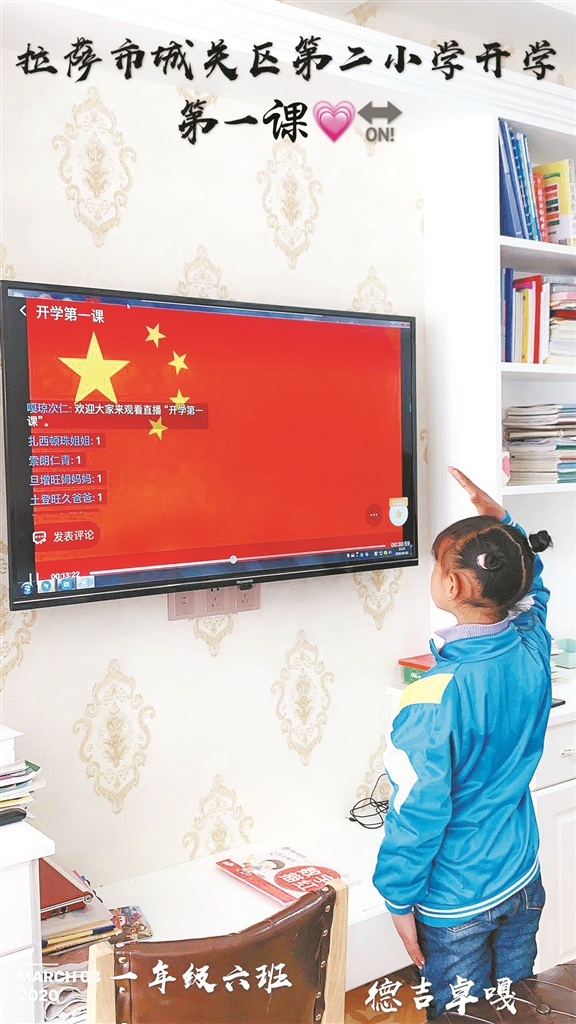 整潔的書桌上擺放著嶄新的教材,穿上干凈的校服、系好鮮艷的紅領巾,西藏拉薩市城關區(qū)第二小學的學生鄭重地舉起右手向電視屏幕里的國旗敬禮。隨后,教師在線上為學生進行授課,而孩子們也在家里開啟了新的上課模式,聽課、記筆記、寫作業(yè)、背書……