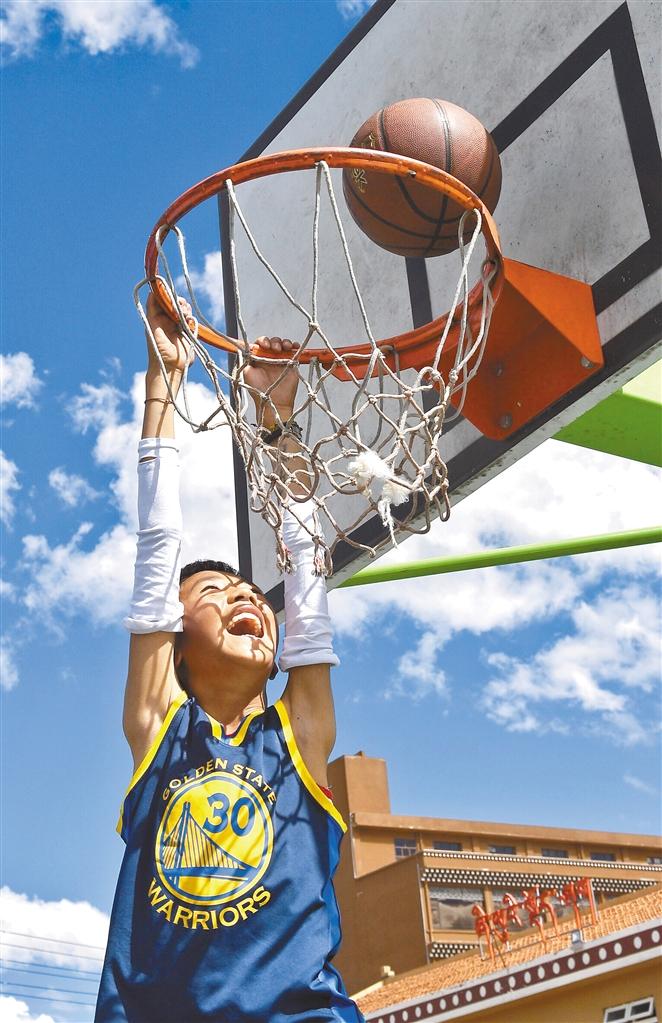 圖為四川省阿壩藏族羌族自治州阿壩縣民族寄宿制小學(xué)的學(xué)生在體育課上練習(xí)扣籃(6月14日攝)。新華社記者 劉坤 攝
