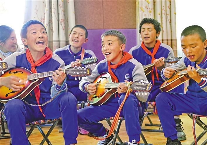 翻越重重大山,穿行茫茫草原,記者來到了四川阿壩藏族羌族自治州阿壩縣。縣民族寄宿制小學(xué)內(nèi)的少年宮里,傳來一陣“嘣嘣嚓”“嘣嘣嘣嚓”的聲音。這是孩子們在彈奏一種叫曼陀鈴的樂器,伴隨著琴弦發(fā)出的聲音,他們合唱著一首當(dāng)?shù)孛裰{。琴聲美妙極了,很像淅淅瀝瀝的細(xì)雨聲,落在心里,特別舒服。