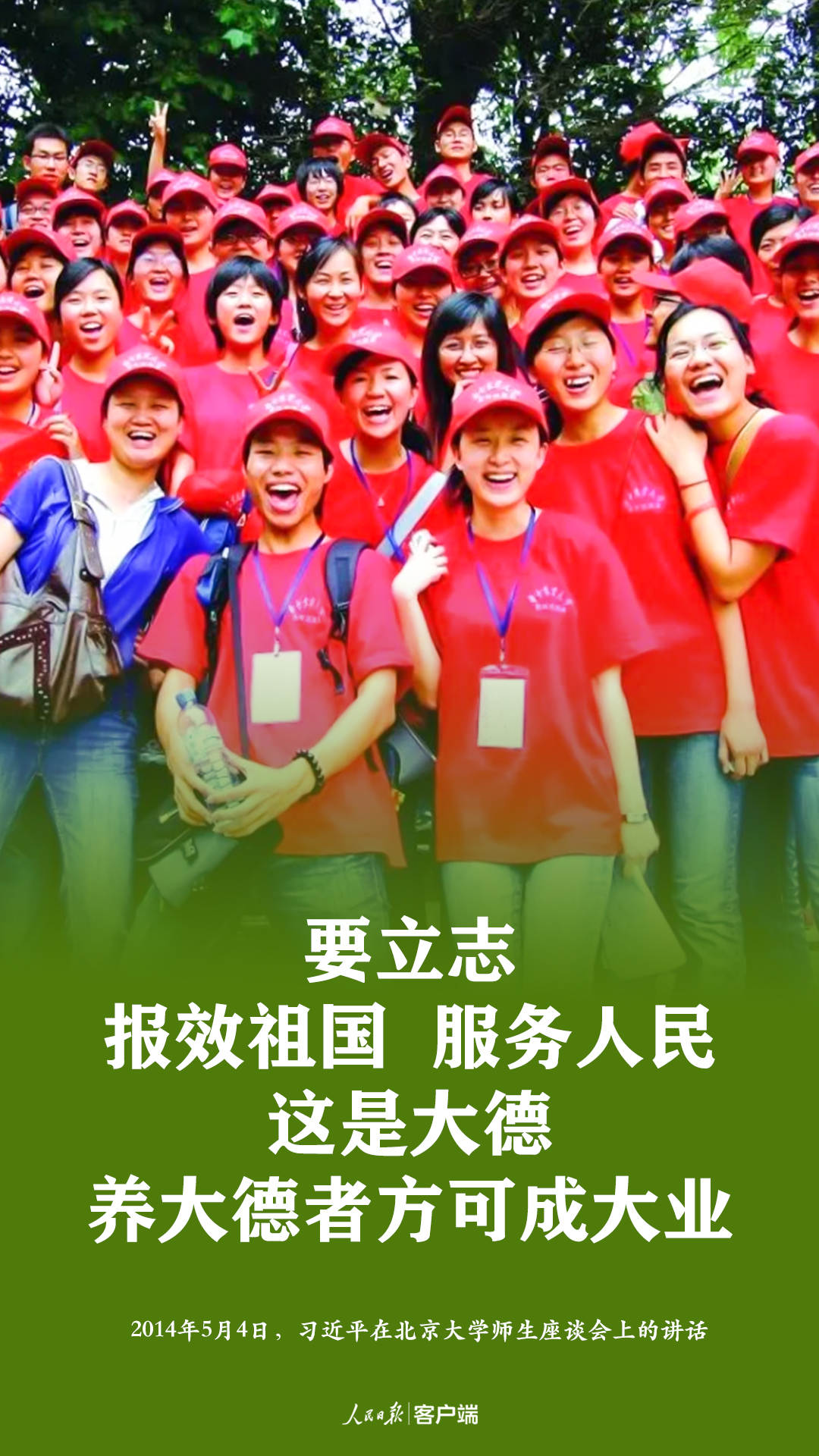 在紀(jì)念五四運(yùn)動(dòng)100周年大會(huì)上,習(xí)近平說(shuō),“對(duì)每一個(gè)中國(guó)人來(lái)說(shuō),愛(ài)國(guó)是本分,也是職責(zé),是心之所系、情之所歸。對(duì)新時(shí)代中國(guó)青年來(lái)說(shuō),熱愛(ài)祖國(guó)是立身之本、成才之基”。