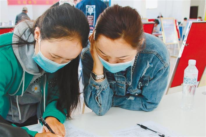 圖為應聘者在填寫報名表。記者 段敏 攝
