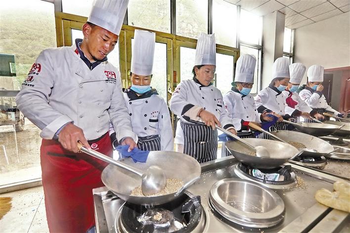 圖為在培訓班上,學員在學習炒菜。次旺 唐斌 攝