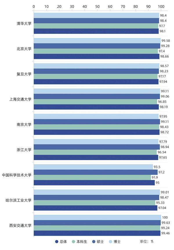 不過(guò),南京大學(xué)成為個(gè)例,博士生就業(yè)率為97.95%,低于本科生和碩士生就業(yè)率。另外,除中國(guó)科大、浙大博士生就業(yè)率略低于碩士生就業(yè)率外,其他高校博士生就業(yè)率均為最高。