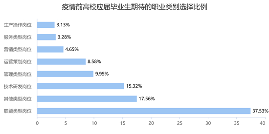 疫情前應(yīng)屆畢業(yè)生期待的職業(yè)類別選擇比例由高到低依次為職能類型崗位(如行政、人事、財務(wù)等,37.53%)、其他類型崗位(17.56%)、技術(shù)研發(fā)崗位(如研發(fā)工程師、測試等,15.32%)、管理類型崗位(9.95%)、運營策劃崗位(如運營、產(chǎn)品、設(shè)計等,8.58%)、服務(wù)類型崗位(如客服、服務(wù)員、店員等,3.28%)、生產(chǎn)操作崗位(如職業(yè)業(yè)生產(chǎn)崗位等,3.13%)。疫情后和疫情前完全一致,選擇比例由高到低依次為職能類型崗位(37.65%)、其他類型崗位(18.08%)、技術(shù)研發(fā)崗位(14.67%)、管理類型崗位(9.79%)、運營策劃崗位(8.40%)、服務(wù)類型崗位(3.53%)、生產(chǎn)操作崗位(3.18%)。