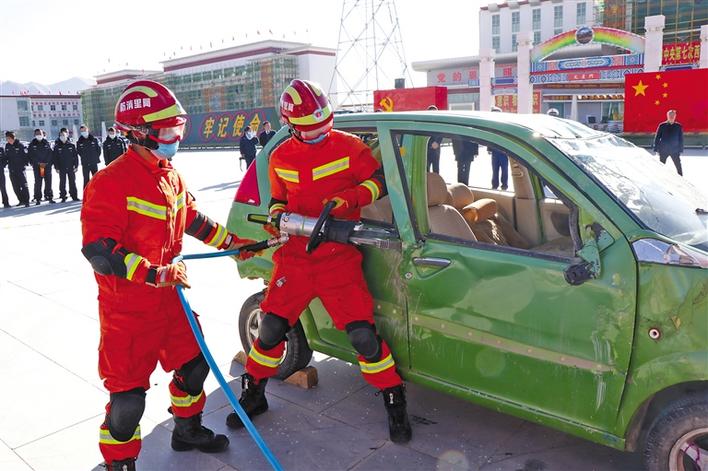 阿里地區(qū)消防員在演示汽車(chē)破拆救援。