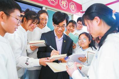 分享結(jié)束后,學生們圍著孟憲實開展進一步交流,并紛紛請他簽名?!拔沂且幻佬g藝術生,但是一直對歷史很感興趣。孟老師的講解更是讓我堅信,以后要更深入地了解歷史知識,在之后的美術作品里融入更多的歷史氣息?!备叨昙壍呐撕缬穑形绯燥垥r依然在回味這場共讀活動。