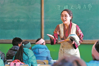 因?yàn)闊釔?ài),所以專注。青海省玉樹藏族自治州囊謙縣東壩鄉(xiāng)寄宿學(xué)校教師桑丁卓瑪,精心準(zhǔn)備每一堂課,認(rèn)真上好每一堂課,受到學(xué)生的喜愛(ài)。這是她在為五年級(jí)學(xué)生上漢語(yǔ)文課。