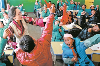 教學(xué)中,桑丁卓瑪注意活躍課堂氣氛,調(diào)動(dòng)學(xué)生的學(xué)習(xí)積極性。一堂漢語(yǔ)文課上,她引導(dǎo)學(xué)生根據(jù)課文描述,模仿主人公拉弓射箭的動(dòng)作。