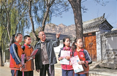 長城腳下美麗的河西村為什么會有137個姓氏?走在村中古樸的小路上,聆聽老支書張玉山的講述,古北口鎮(zhèn)中心小學學生探尋河西村多民族、多姓氏融合的“百姓村”成因。樊世剛 攝