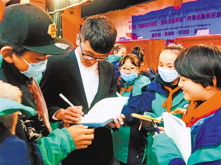 宣講活動過程中,共青團(tuán)西藏自治區(qū)委員會副書記格桑卓瑪、西藏青年報社副社長洛桑頓珠給6所學(xué)校內(nèi)地西藏班的學(xué)生們贈送了《西藏青年報》《西藏青年》等刊物和書籍。格桑卓瑪語重心長地囑咐孩子們:“作為新時代的新青年,要時刻牢記時代賦予的新使命,要用新時代的標(biāo)尺審視自己,用科學(xué)文化武裝自己,淡化宗教消極影響,在新征程的熔爐中鍛造自己,努力使自己成為堪當(dāng)民族復(fù)興大任的新青年,在全面建設(shè)社會主義現(xiàn)代化國家新征程中貢獻(xiàn)自己的青春力量,做神圣國土的守護(hù)者、幸福家園的建設(shè)者,在青春的閃光中踐行‘感黨恩、愛核心、聽黨話、跟黨走’的家國情懷?!?/p>