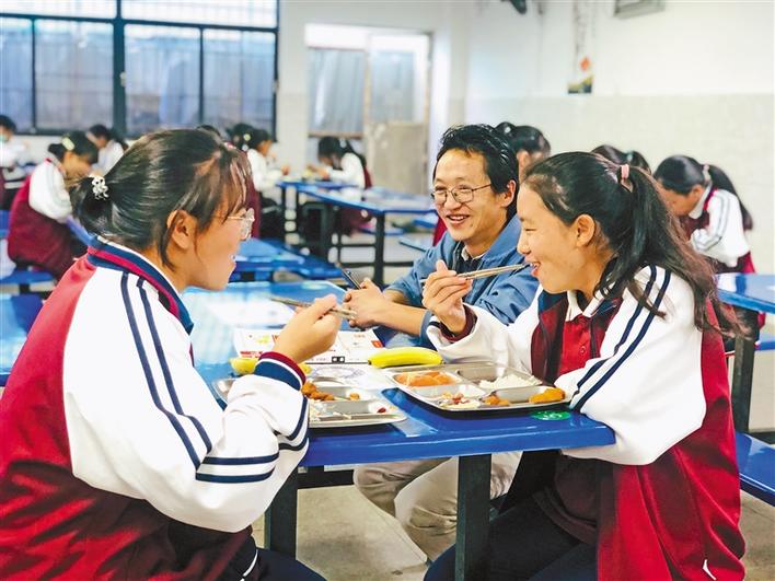 西藏青年報社副社長洛桑頓珠(右二)在珠海四中學(xué)校食堂與內(nèi)地西藏班學(xué)生進(jìn)行交談。