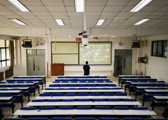 2020年7月14日,山東省青島市,一名教師在山東科技大學一間空曠的教室里通過屏幕進行“云”監(jiān)考。受疫情影響,該校采用線上的方式進行期末考試。孫德波/攝