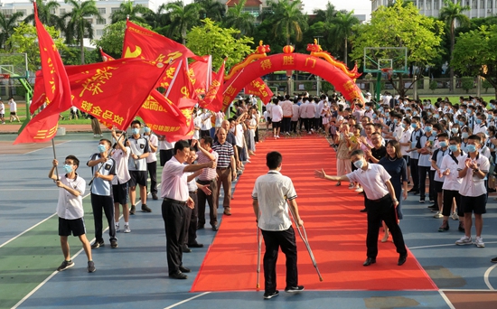 2020年7月6日,廣西南寧市第三十三中學,一名拄著拐杖的高考生在老師同學的鼓勵下走向“得勝門”。當日,該校舉辦高考“出征”儀式,祝福學生高考取得勝利。區(qū)明慶/攝