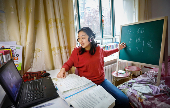 2020年3月25日,江蘇省連云港市,一名小學語文教師在家中給學生線上授課。受疫情影響,學校提倡 “停課不停學”,號召學生在家上課。張曉青/攝