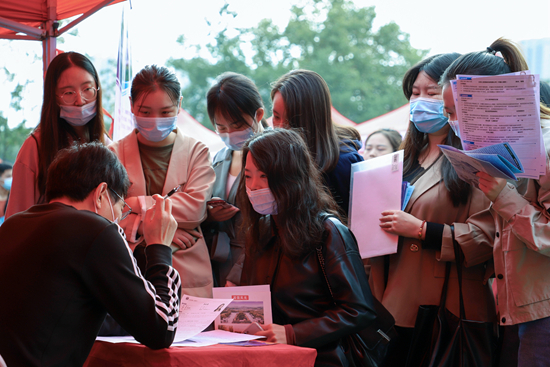 2020年10月24日,湖北省武漢市,華中師范大學武漢部屬高校聯(lián)合招聘會上,畢業(yè)生與用人單位交流。唐麗香/攝