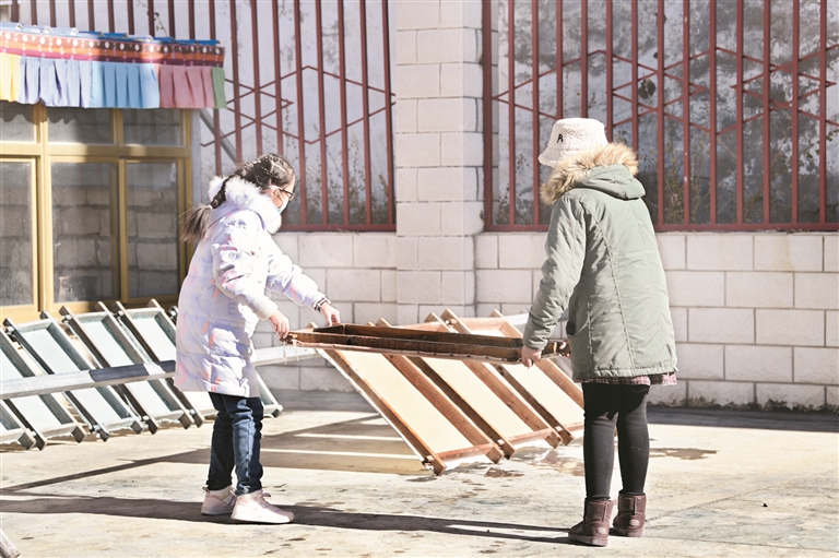 圖為學(xué)生在老師指導(dǎo)下,體驗(yàn)雪拉藏紙的制作過程。貢嘎來松攝