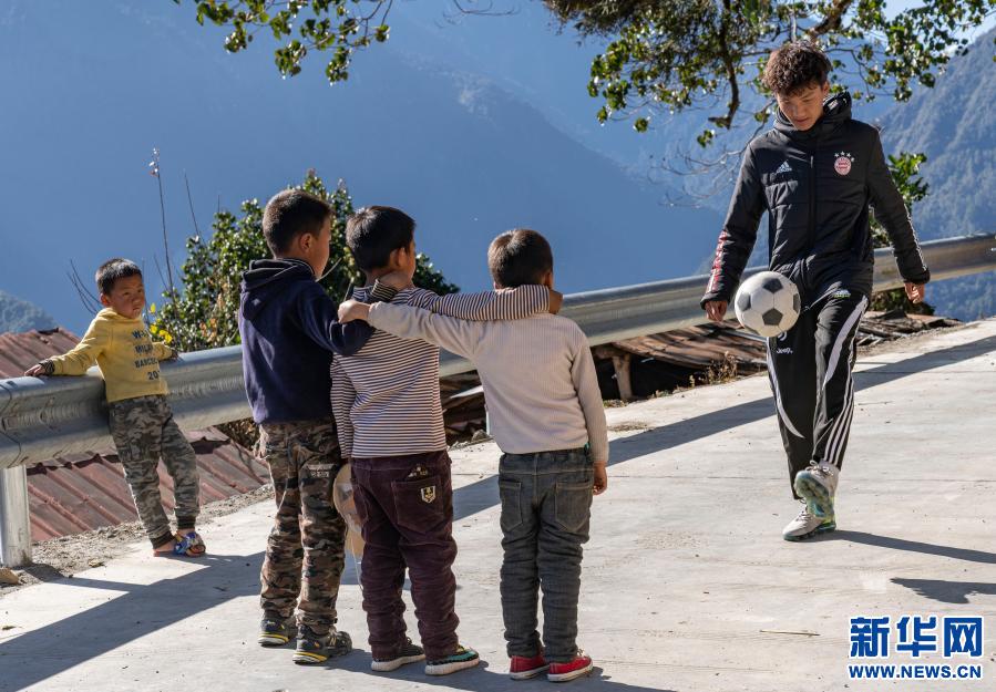 在西藏林芝市墨脫縣德興鄉(xiāng)巴登則村,旺前羅布向弟弟們展示自己的球技(2月9日攝)。新華社記者 孫非 攝