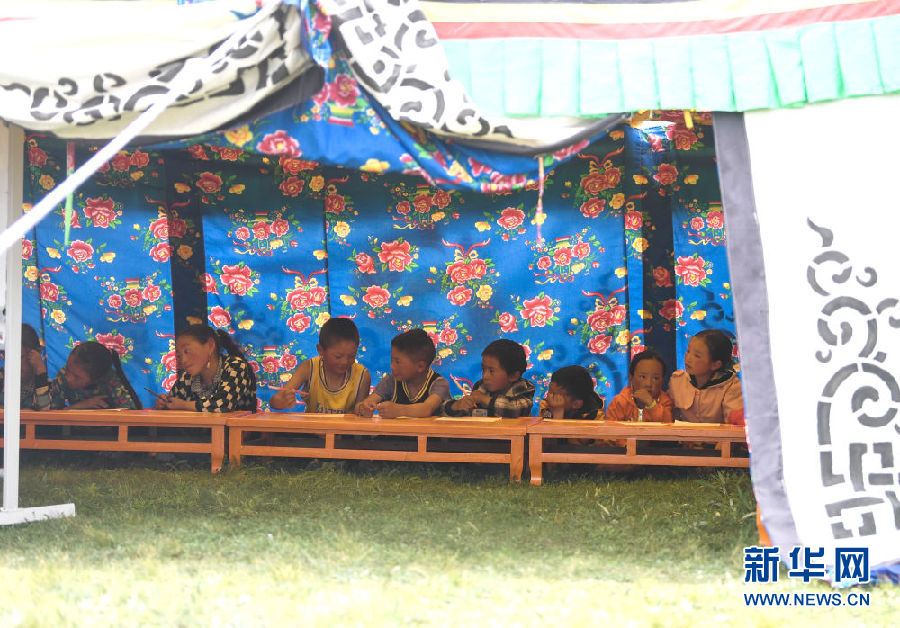8月2日,在青海省果洛藏族自治州瑪沁縣下大武鄉(xiāng)年扎村“育苗加油站”的帳篷里,小朋友們在進行繪畫。新華社記者 張龍 攝
