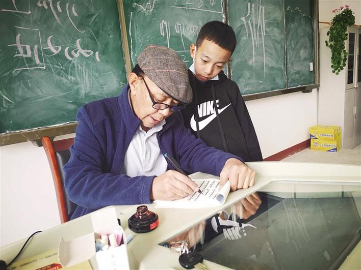 老師正在教學(xué)生藏文書法。記者 張雪芳 攝影報(bào)道