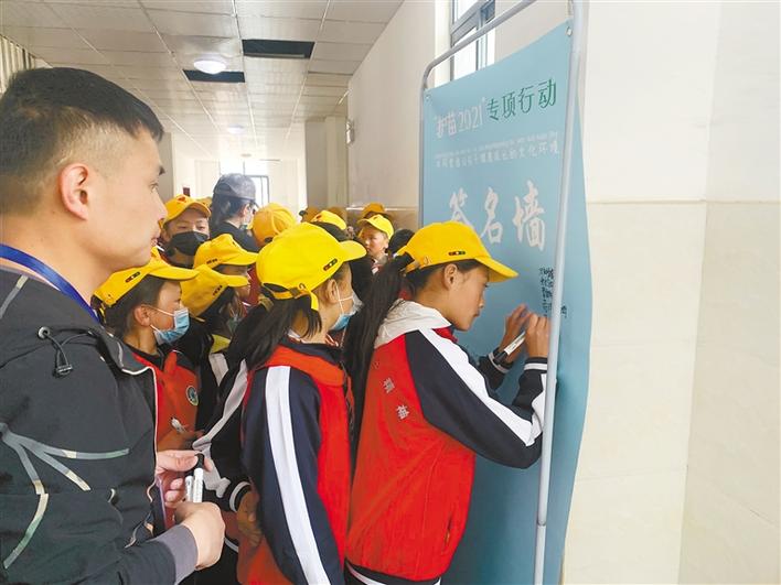 學(xué)生在“護(hù)苗2021”專項(xiàng)行動(dòng)簽名墻上簽名。記者 張宇 攝