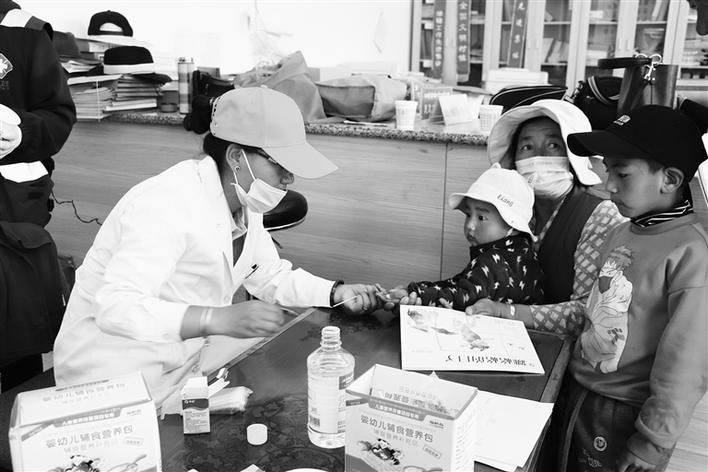 工作人員為兒童檢查身體并免費(fèi)發(fā)放“營(yíng)養(yǎng)包”。圖由西藏自治區(qū)衛(wèi)健委婦幼健康處 提供