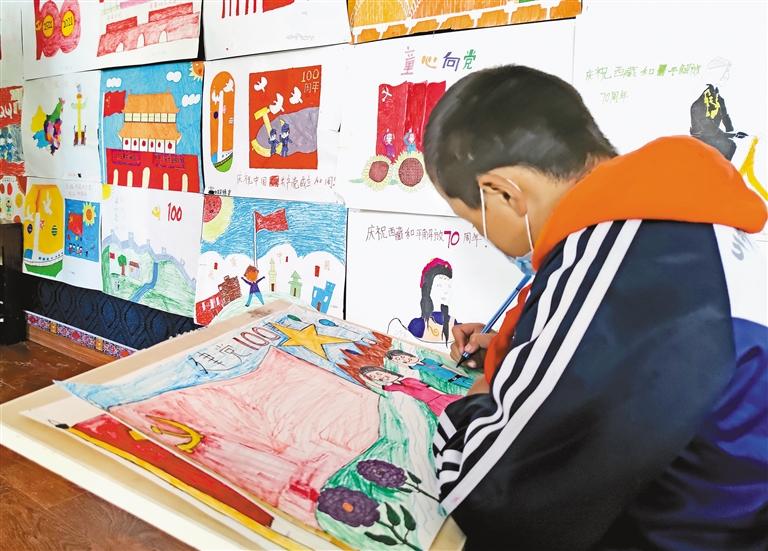 在白朗縣嘎東鎮(zhèn)中心小學(xué)少年宮,繪畫(huà)愛(ài)好者創(chuàng)作“慶祝建黨100周年”主題畫(huà)。記者 汪純 攝