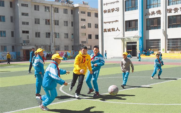 圖為拉薩市第三小學(xué)學(xué)生課間在操場上踢足球。記者 洛桑 攝