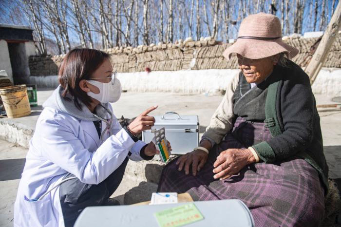 倉(cāng)木拉(左)叮囑村民要按時(shí)吃藥(2021年12月21日攝)。新華社記者 孫瑞博 攝
