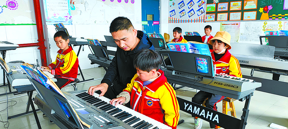 “我會教他們認樂譜、怎么卡節(jié)奏、唱什么聲部,經(jīng)過長期堅持學(xué)習(xí),孩子們進步很快?!敝艿猛呏笇?dǎo)學(xué)生彈奏電子琴的指法,邊笑著和我們聊到,自從2017年,學(xué)校配備了專門的音樂教室,每堂課他都會堅持使用樂器,以此來培養(yǎng)孩子們的音樂素養(yǎng),效果非常不錯。