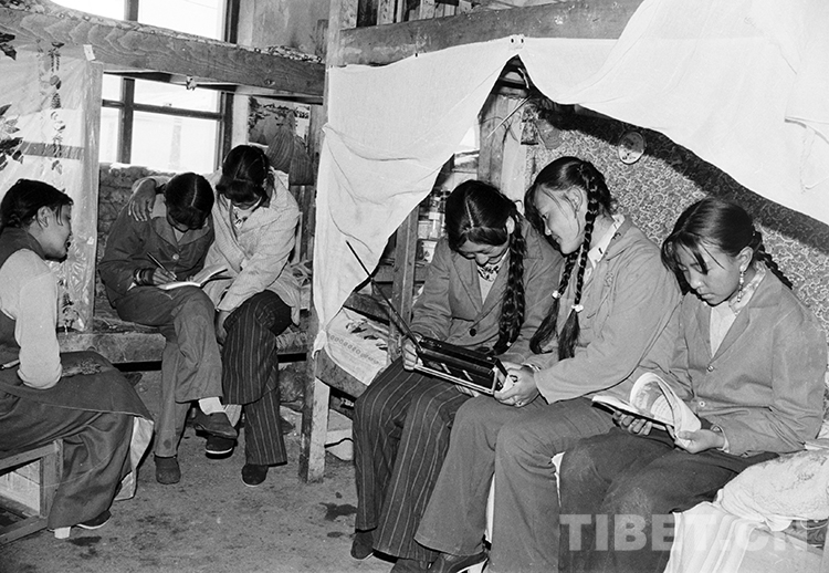 這是班戈縣中學(xué)寄宿女學(xué)生在宿舍里聽廣播和學(xué)習(xí)(唐召明1987年攝)