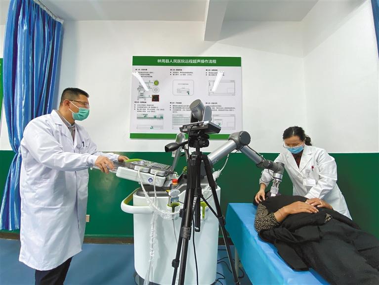 蘇州市援藏工作組引進(jìn)第一臺5G遠(yuǎn)程超聲機(jī)器人。圖為醫(yī)生使用遠(yuǎn)程超聲機(jī)器人為患者檢查。