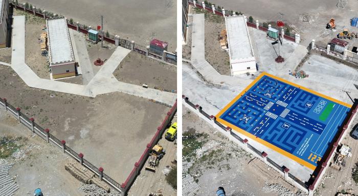 扎西宗鄉(xiāng)完全附屬小學(xué)幼兒園操場(chǎng)建設(shè)前后航拍對(duì)比圖
