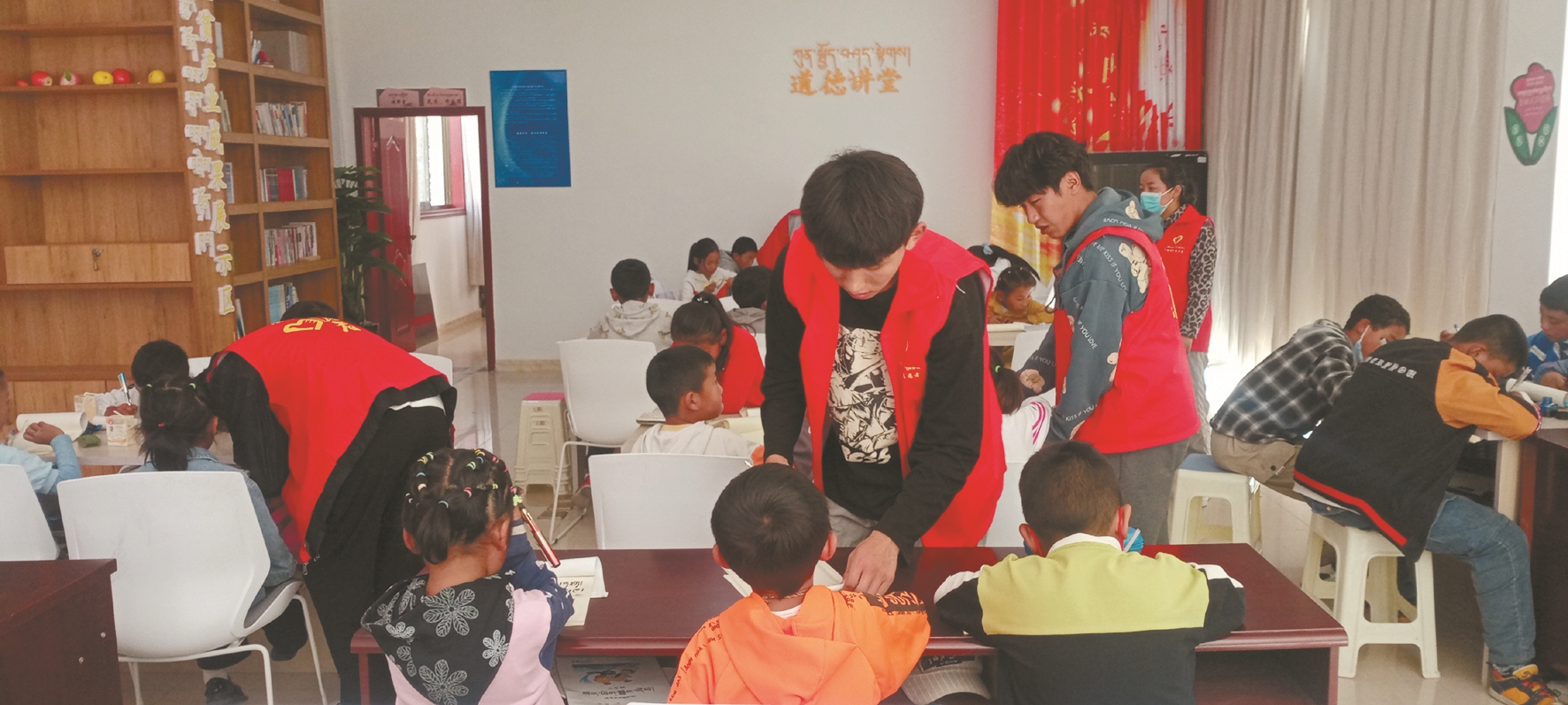 圖為7月25日,桑達(dá)村大學(xué)生為孩子們提供作業(yè)輔導(dǎo)、日間托管服務(wù)。 拉薩融媒記者 齊永昌攝