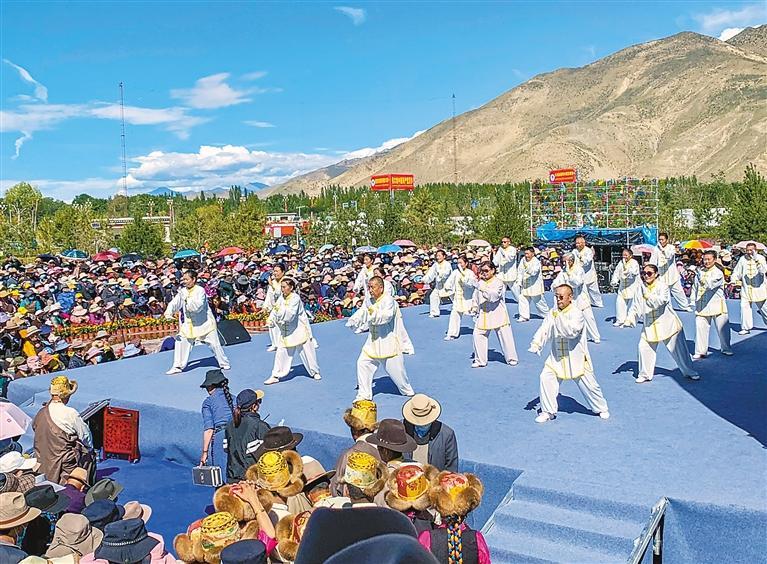 西藏自治區(qū)山南市各族太極拳愛好者進行傳統(tǒng)楊氏太極拳表演。