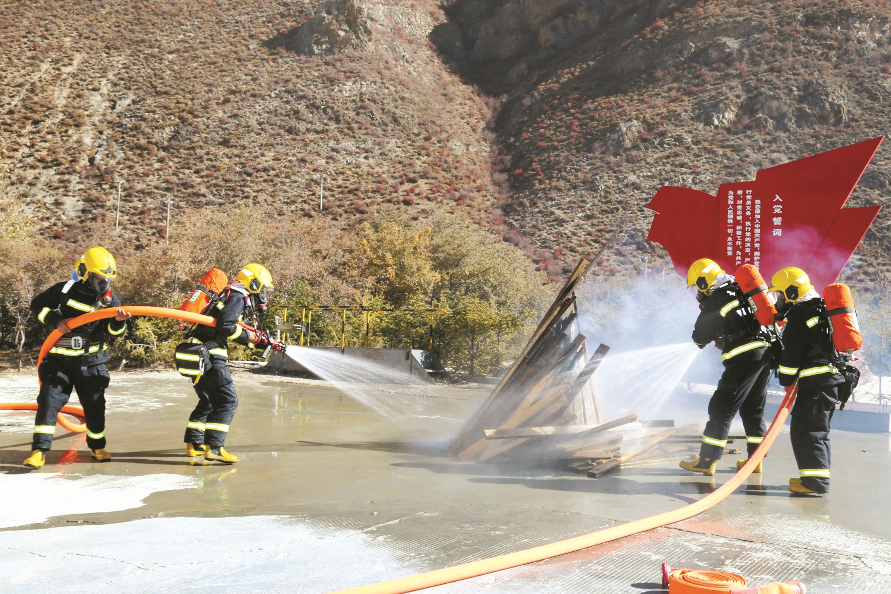 圖為啟動(dòng)儀式現(xiàn)場,消防員進(jìn)行滅火救援演練。拉薩融媒通訊員德吉卓嘎攝