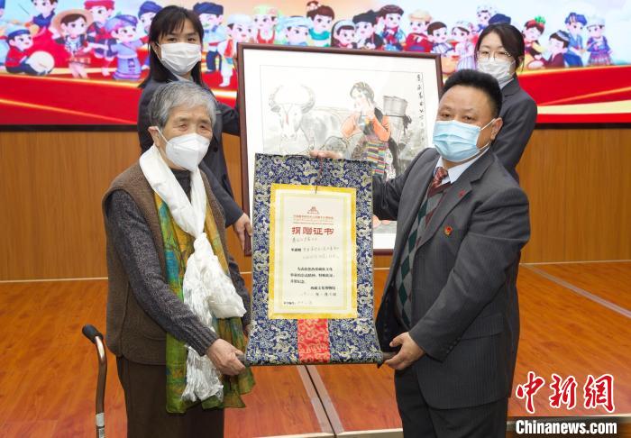 圖為活動(dòng)當(dāng)天知名畫(huà)家吳茜向中國(guó)藏學(xué)研究中心西藏文化博物館捐贈(zèng)西藏主題作品?!≈袊?guó)藏學(xué)研究中心供圖