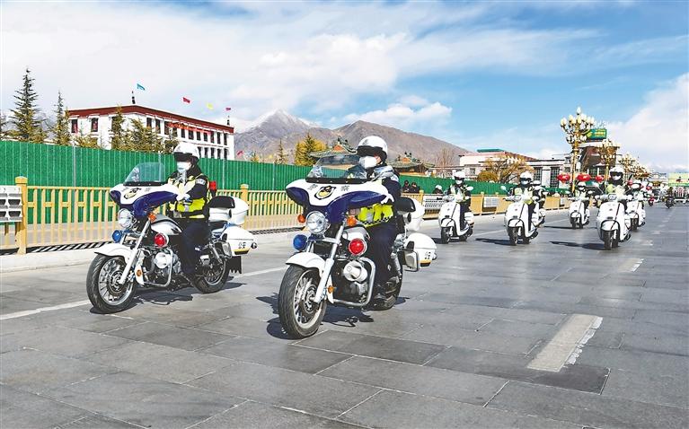 拉薩市公安局交警支隊(duì)城北大隊(duì)女子中隊(duì)的交警正在巡邏。記者 唐斌 攝
