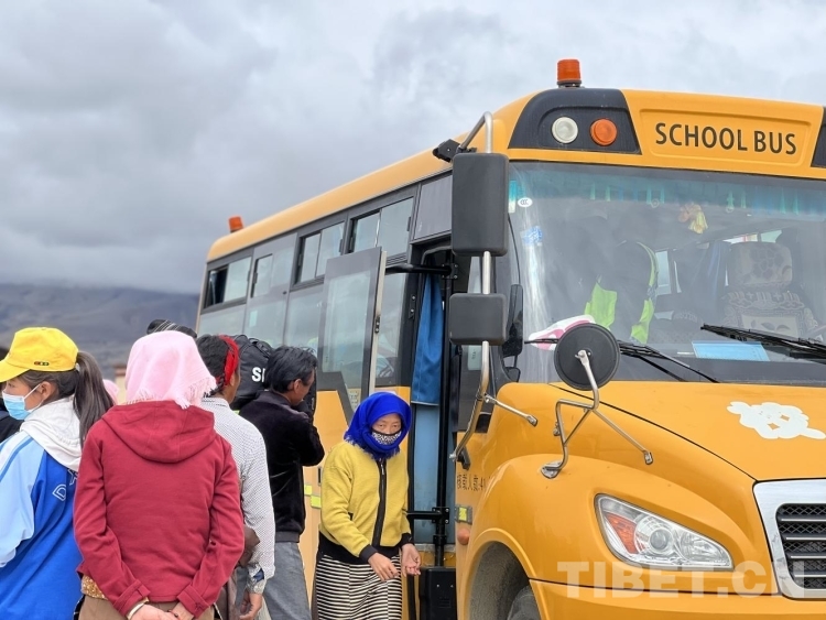 上午十一點,穿著牧區(qū)藏袍、頭戴淺色頭巾的婦女和紅色“扎秀”(辮尾)的男士背起牛羊毛編織的背包,牽著自家小孩的手紛紛到達集合點?!靶\噥砝玻 睂W生們在村委會院子里自覺排起了隊。
